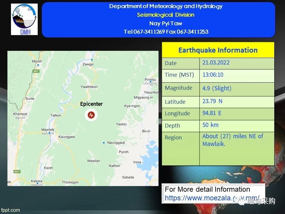 缅甸实皆省 据气象部门称,2022 3月21日 13 时缅甸标准时间 (06 分钟)在 10 秒内,距塔木地震现场东南约 43 英里(毛莱克东北约 27 英里);北纬 (23.79) 度。经度为东经 94.81 度。记录到震中 50 公里深度的 4.9 级地震。