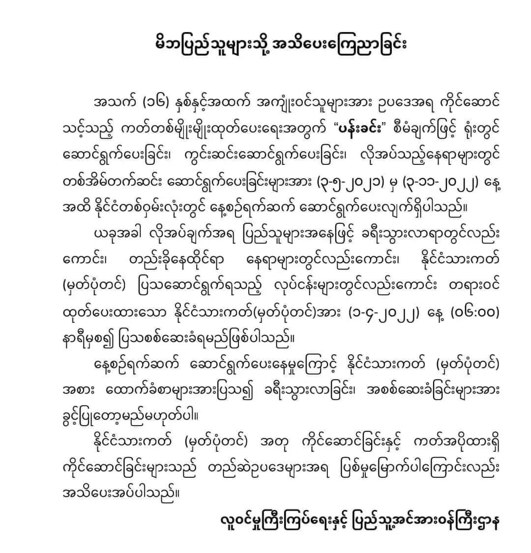 缅甸移民监督及人口管理部表示,从 2021 年 5 月至 2022 年 11 月,有按既定“班钦”(ပန်းခင်းစီမံချက်)计划,相关部门持续在为 16 岁及以上的民众办理身份证,在偏远地区还上门办理身份证件。因此从4月1日早上6点开始,民众们旅行时或住宿或检查身份证时需要出示当局颁发的合法身份证。不再允许出示街区等提供的证明书,出行必须携带身份证。