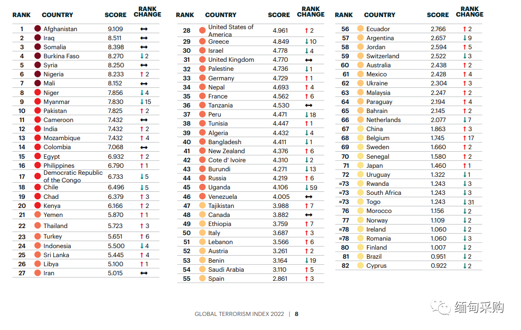 据全球恐怖主义指数 (Global Terrorism Index)发布的数据显示,该组织对全球范围,因恐袭罹难者人数进行统计研究后,发布了2022年全球恐怖袭击指数报告,本报告于2022年3月2日发布。