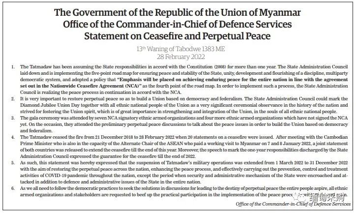 当地时间2月28日,缅甸国防军司令部发布公告,宣布将停火期限延长至2022年12月31日。
