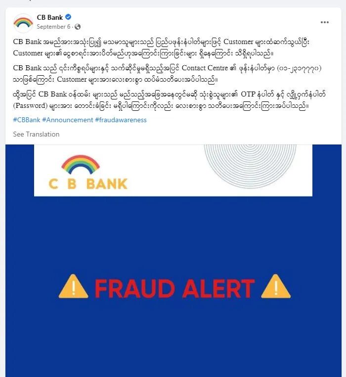 近期,缅甸境内针对银行用户的电信诈骗,又开始活络了起来。为了防止用户上当受骗,KBZ银行、CB银行、伊洛瓦底银行等,相继发布了警示信息。虽然大部分民众已经对此类诈骗信息见怪不怪,但是,仍然有民众因为一时疏忽被骗。