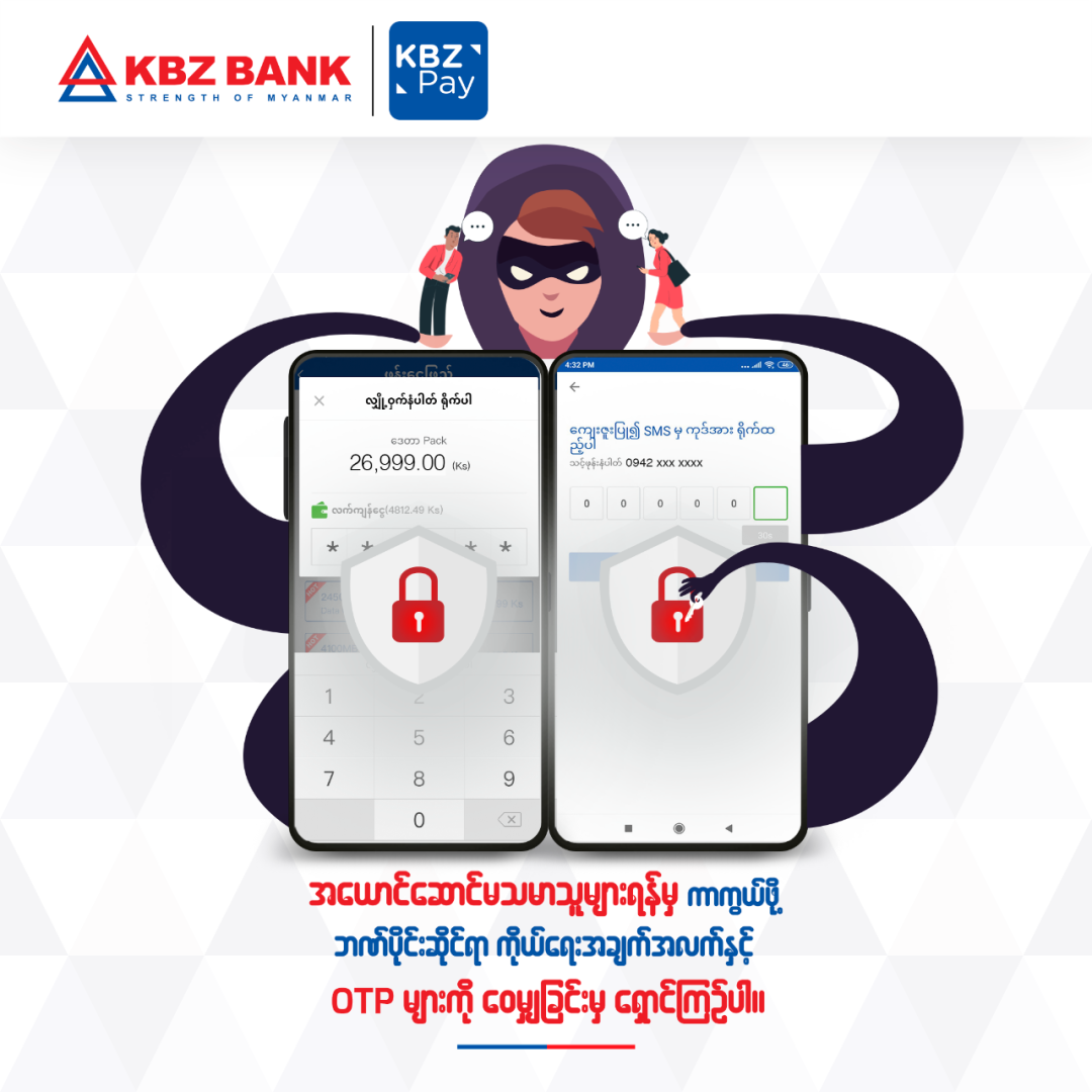 从KBZ银行声明中得知,KBZ银行员工在给客户拨打电话时,不会索要i/m banking username 、password,OTP code,credit/Debit Card号码、有效期及相关隐私信息。