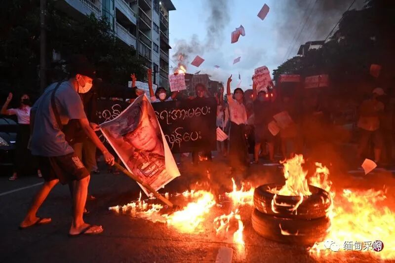 缅甸的反军政示威仍持续不断。周三晚上在最大城市仰光,示威人群在大街上焚烧军政府领导人敏昂莱的大照片。(法新社)