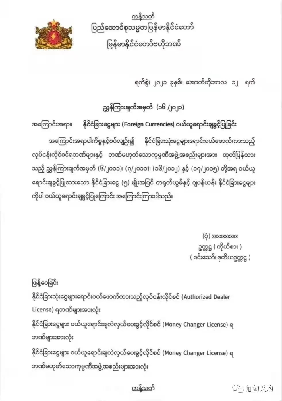 缅甸央行在这则通告中说,即日起准许持有外汇交易牌照的银行和私人货币兑换机构使用人民币和日元进行外汇交易,合法开展外汇买卖业务。