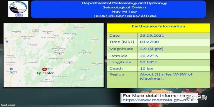 今天凌晨 3 点 27 分,在 Maukme 镇以西 3 英里处,北纬20.22度;东经97.68度;据报道,发生了深度 10 公里的 3.9 级地震。