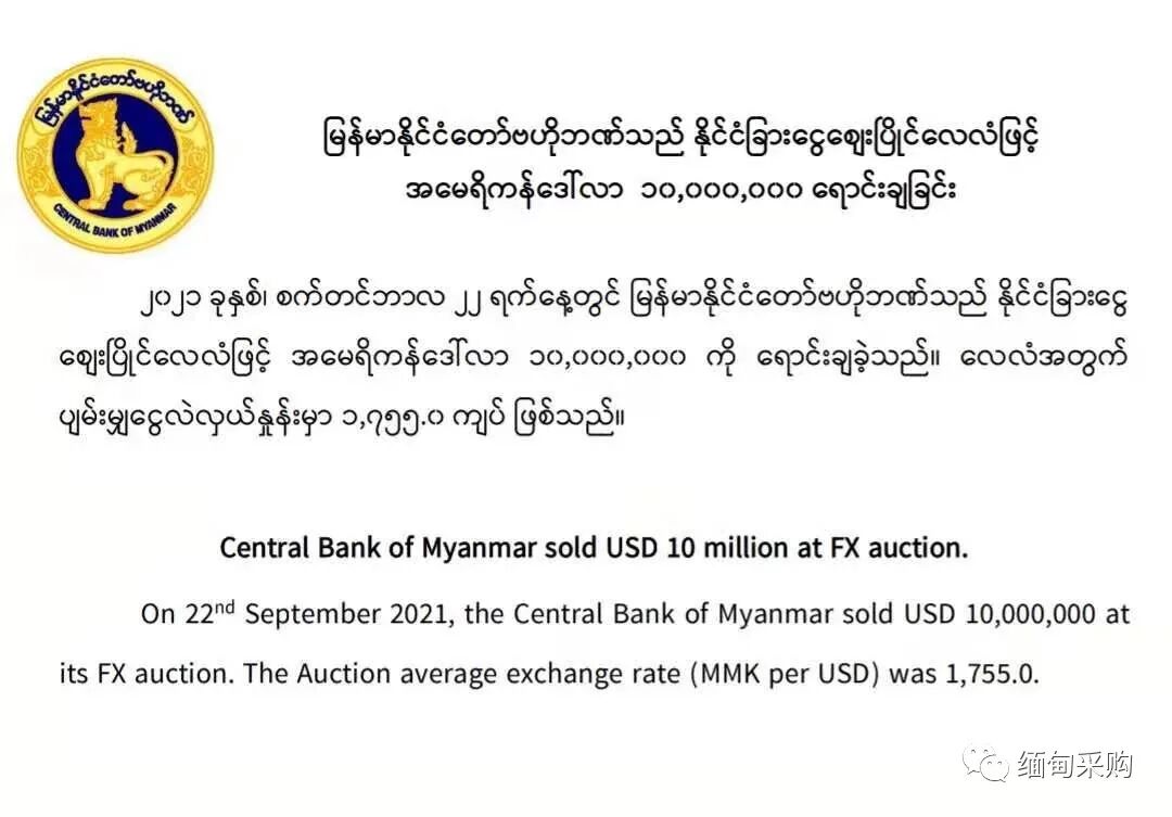 当地时间9月22日,缅甸央行宣布以1755缅币兑换1美元的价格向市场投放1000万美元以平衡缅币汇率。
