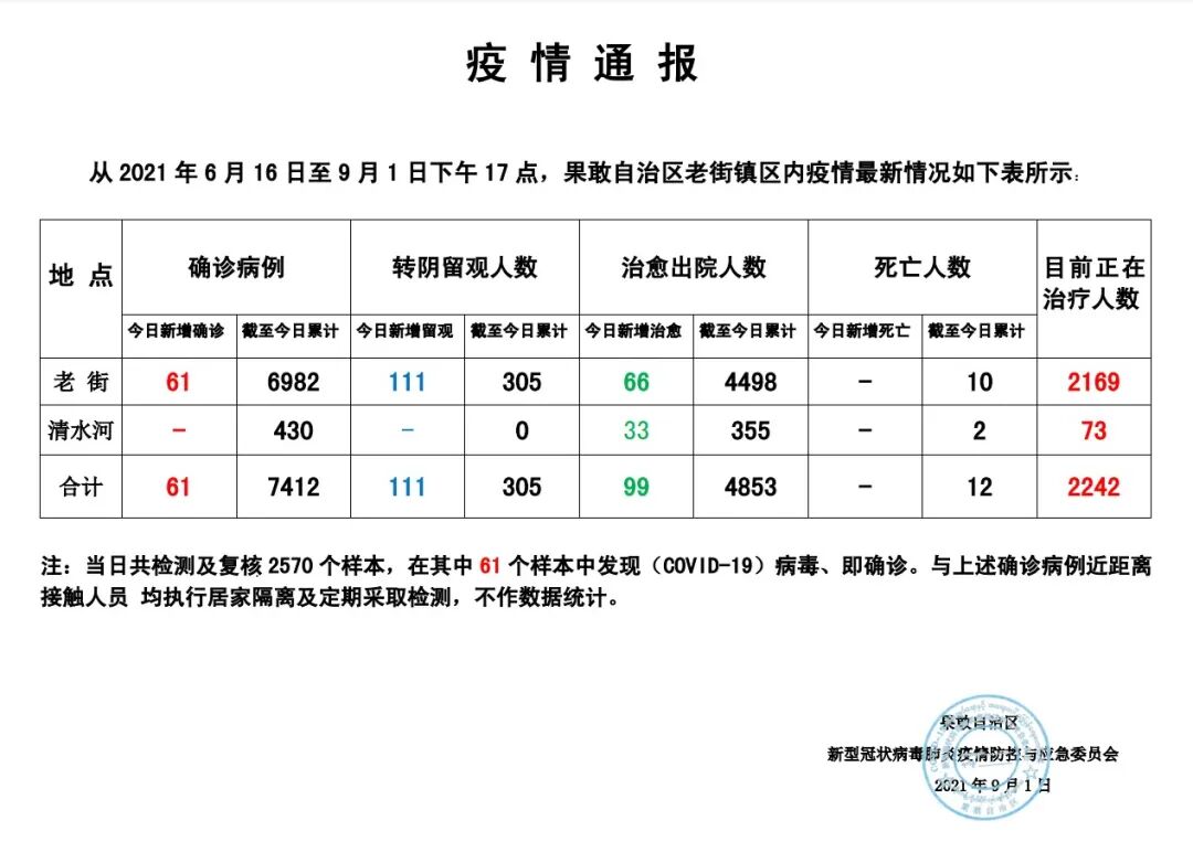 从2021年6月16日至9月1日下午17点,果敢自治区老街镇区内疫情最新情况如下表所示: