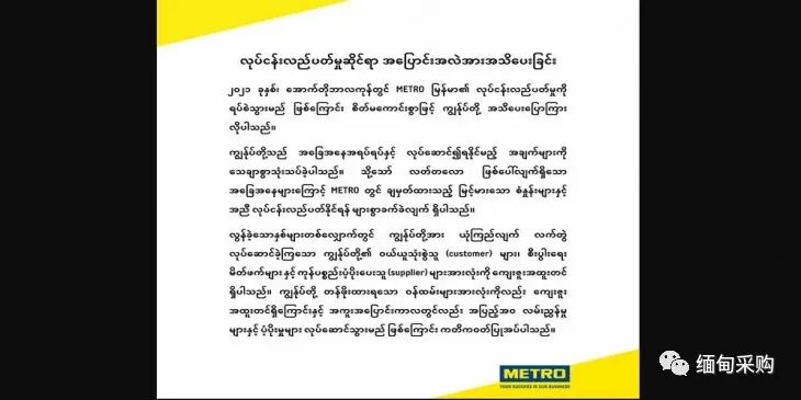 德国知名批发公司麦德龙METRO Wholesale缅甸宣布将在两个月内停止在缅甸的业务。