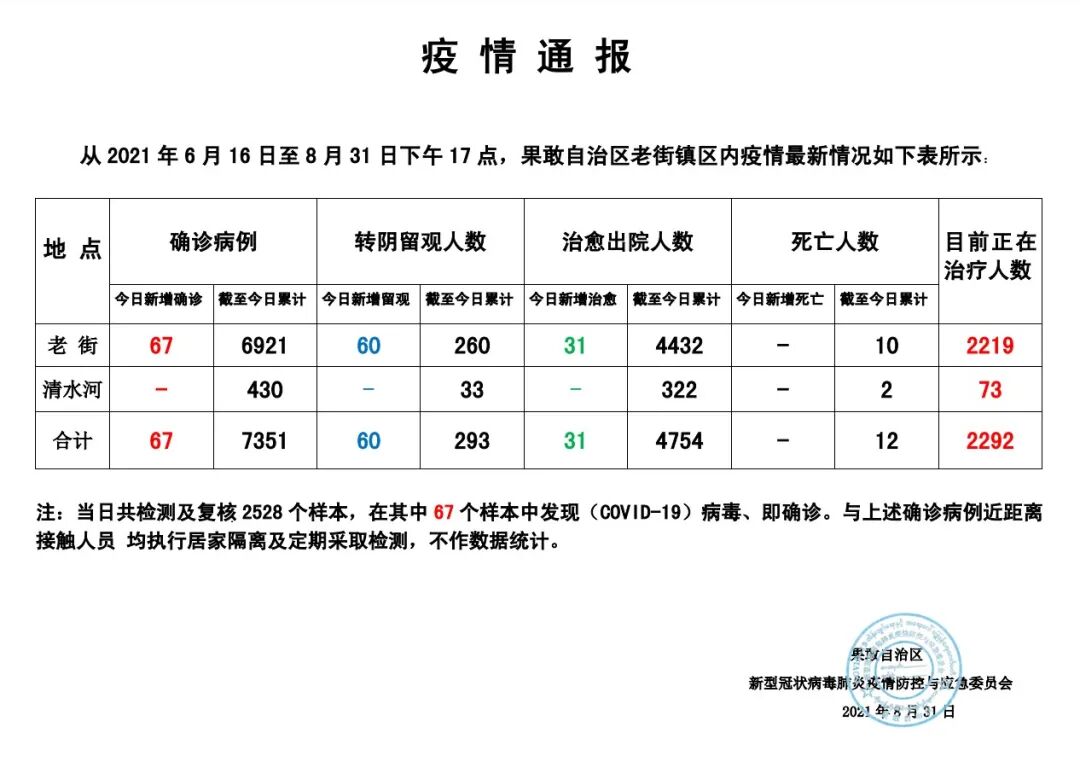 从2021年6月16日至8月31日下午17点,果敢自治区老街镇区内疫情最新情况如下表所示: