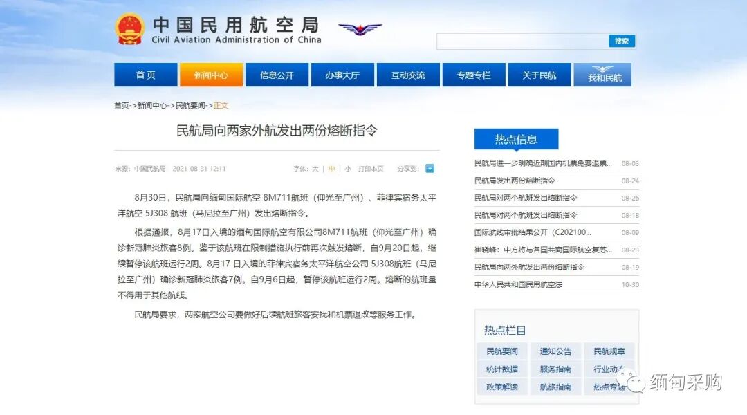 民航局向缅甸、菲律宾的两家外航发出两份熔断指令