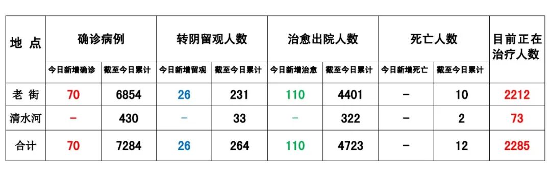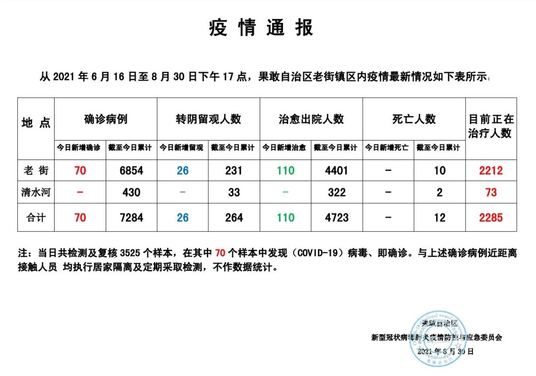 从2021年6月16日至8月30日下午17点,果敢自治区老街镇区内疫情最新情况如下表所示:
