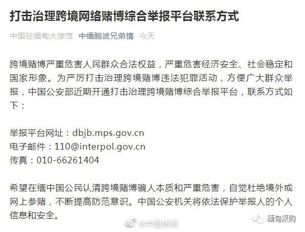 据中国驻缅甸大使馆微信公众号消息,跨境赌博严重危害人民群众合法权益,严重危害经济安全、社会稳定和国家形象。为严厉打击治理跨境赌博违法犯罪活动,方便广大群众举报,中国公安部近期开通打击治理跨境赌博综合举报平台,联系方式如下: