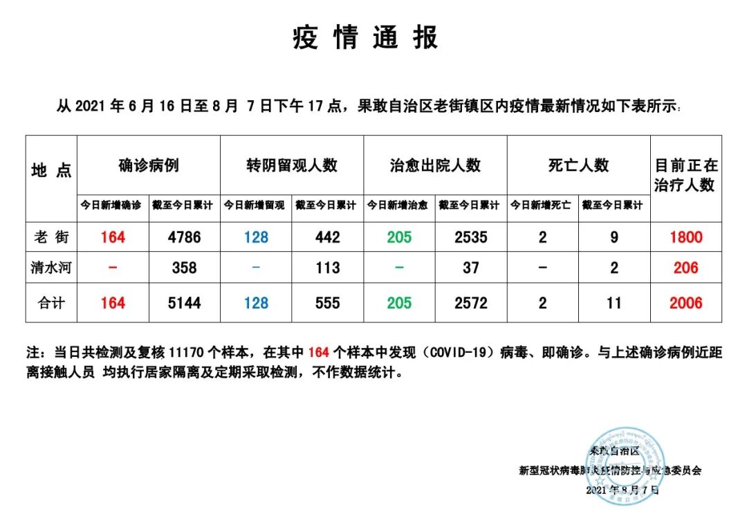 从2021年6月16日至8月7日下午17点,果敢自治区老街镇区内疫情最新情况如下表所示: