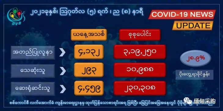 据缅甸卫生与体育部公布的数据:截止8月5日缅甸时间20:00,检测14284例,发现确诊病例+ 4132 例,累计确诊病例319250例,治愈出院230308人,死亡病例累计10988例<+293例>。 #缅甸采购#