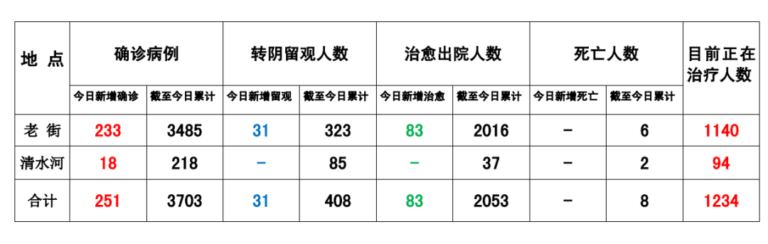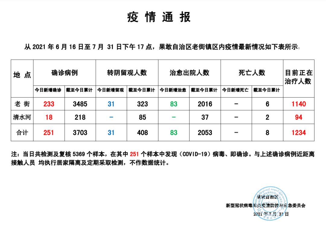 从2021年6月16日至7月31 日下午17点,果敢自治区老街镇区内疫情最新情况如下表所示: