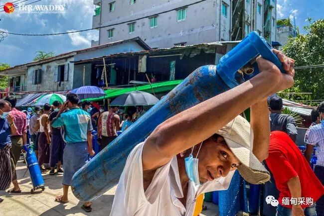 图片:人们在仰光争抢氧气瓶。许多新冠肺炎病人被医院拒之门外。/伊洛瓦底江