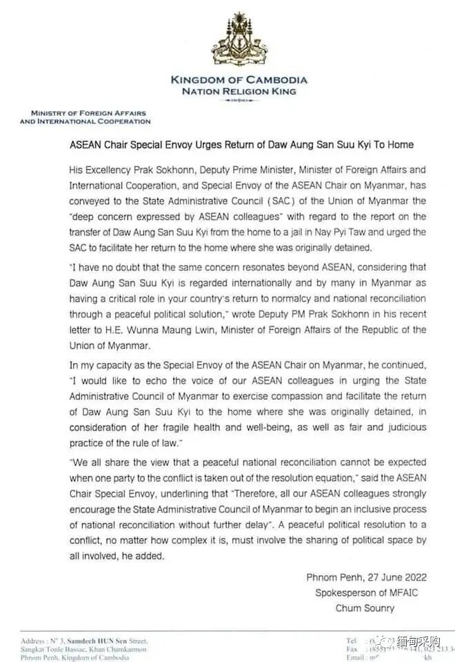 柬埔寨外长普拉萨德坤Prak Sokhonn致函缅甸外长吴温娜貌伦(U Wanna Maung Lwin)中写道,昂山素季是一位国际公认的女士,也在缅甸民族和解中发挥着重要作用。依据相关法律采取公正的方式,考虑昂山素季虚弱的健康情况、响应东盟合作伙伴的呼吁,将昂山素季送回原来的住宅。