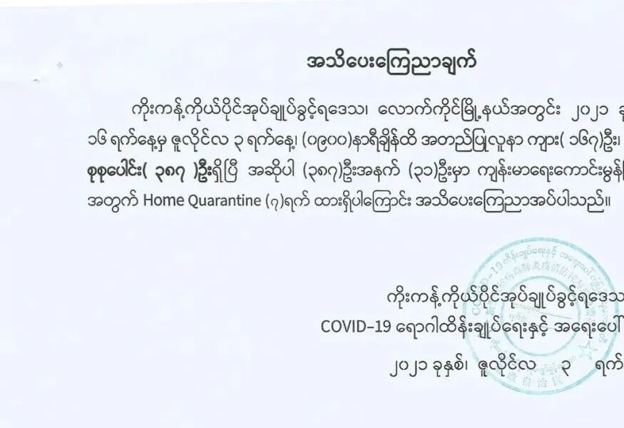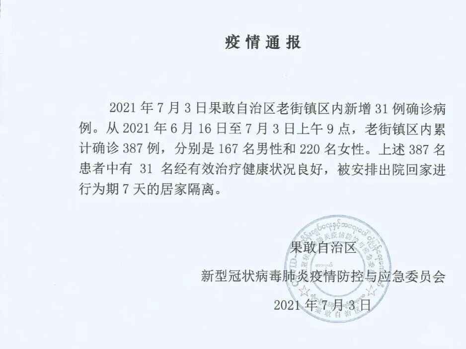 2021年7月3日果敢自治区老街镇区内新增31例确诊病例。从2021年6月16日至7月3日上午9点,老街镇区内累计确诊387例,分别是167名男性和220名女性。上述387名患者中有31名经有效治疗健康状况良好,被安排出院回家进行为期7天的居家隔离。