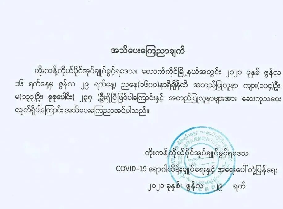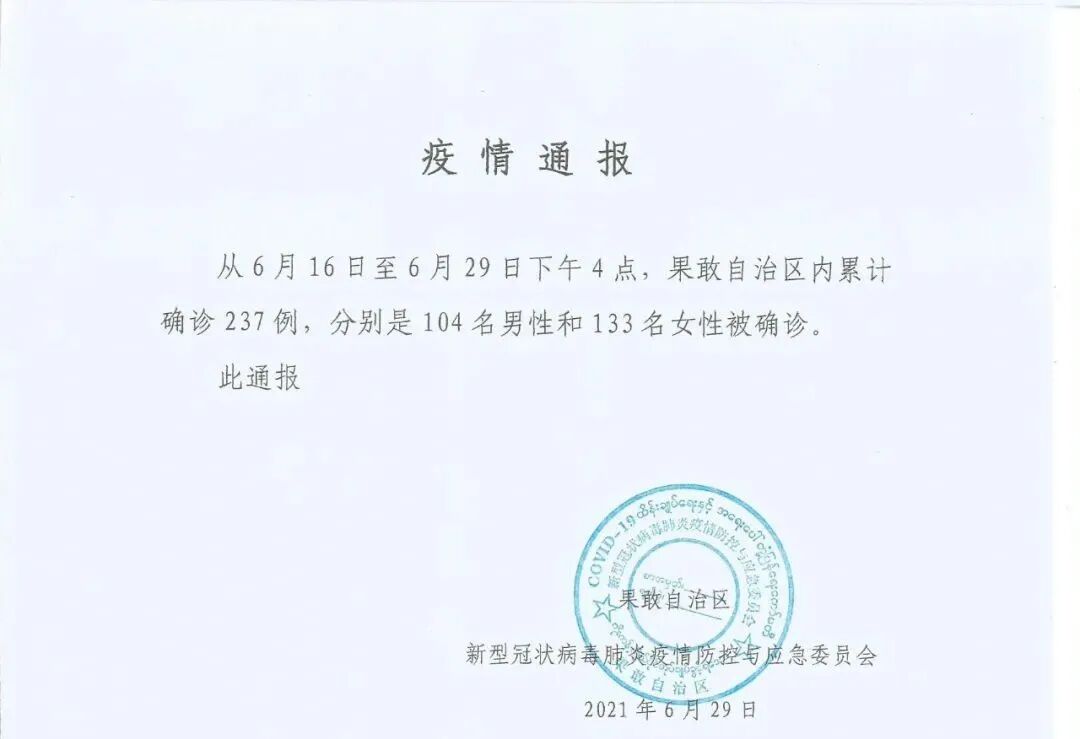 果敢自治区 新型冠状病毒肺炎疫情防控与应急委员会 2021年6月29日