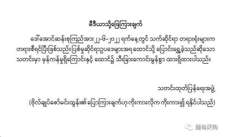 本公众号"缅甸采购"所推送内容均源自网络,不代表任何政治立场,仅供阅读、欣赏!我们对文中观点保持中立,对所包含内容准确性、可靠性或完整性不提供任何明示或暗示的保证,并不对文中观点负责。版权属原作者。如有侵权,请联系我们及时修正删除。微信号: t990528
