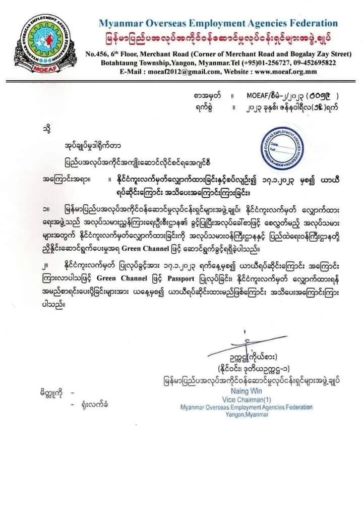 1月16日,缅甸海外就业服务企业家联合会,向国内获得正规授权的海外工作介绍所发函件。从函件中得知,自1月17日起,将临时关闭MOU劳工的绿色通道,暂停新护照申请及二维码预约。