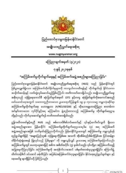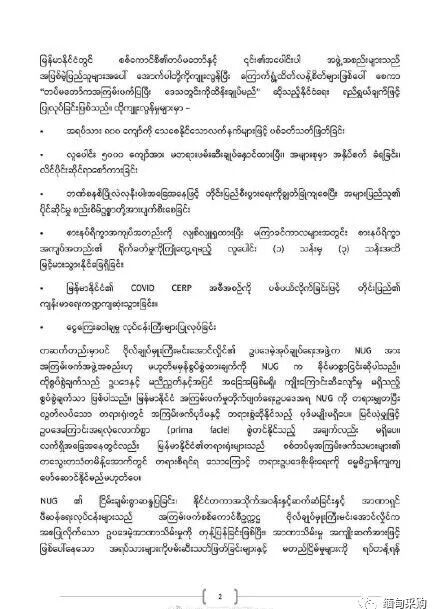 民族团结政府(NUG)宣布,根据缅甸反恐怖主义法的第3条,军事委员会及其附属机构为恐怖组织。这些罪行包括用致命武器杀死 800 多名平民;5000多人被任意拘留,其中大部分人遭受酷刑;性骚扰; 银行系统的几近崩溃摧毁了该国的经济并破坏了公共财产。粮食危机被忽视,粮食危机影响的饥饿难民风险在不久的将来可能会从100万增加到300万。由于军事政变使该国的 COVID CERP 计划被瘫痪,该国的卫生部门已经崩溃。NUG还承诺与国际社会合作,防止和打击军事委员会及其附属机构犯下的暴力行为。