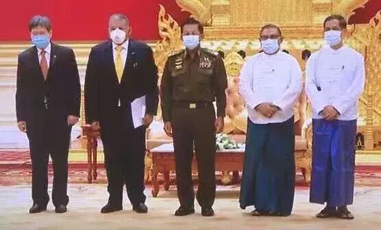 4日,敏昂莱在内比都会见了东盟轮值主席国文莱外交事务主管部长艾瑞万和东盟秘书长林玉辉。会谈内容包括4月24日在印度尼西亚首都雅加达举行的东盟领导人缅甸问题特别会议成果落实情况、国家和平稳定后重新举行大选以及人道主义援助等。