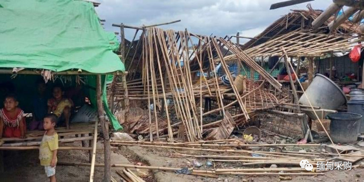 缅甸若开邦难民营上百间房屋被飓风摧毁