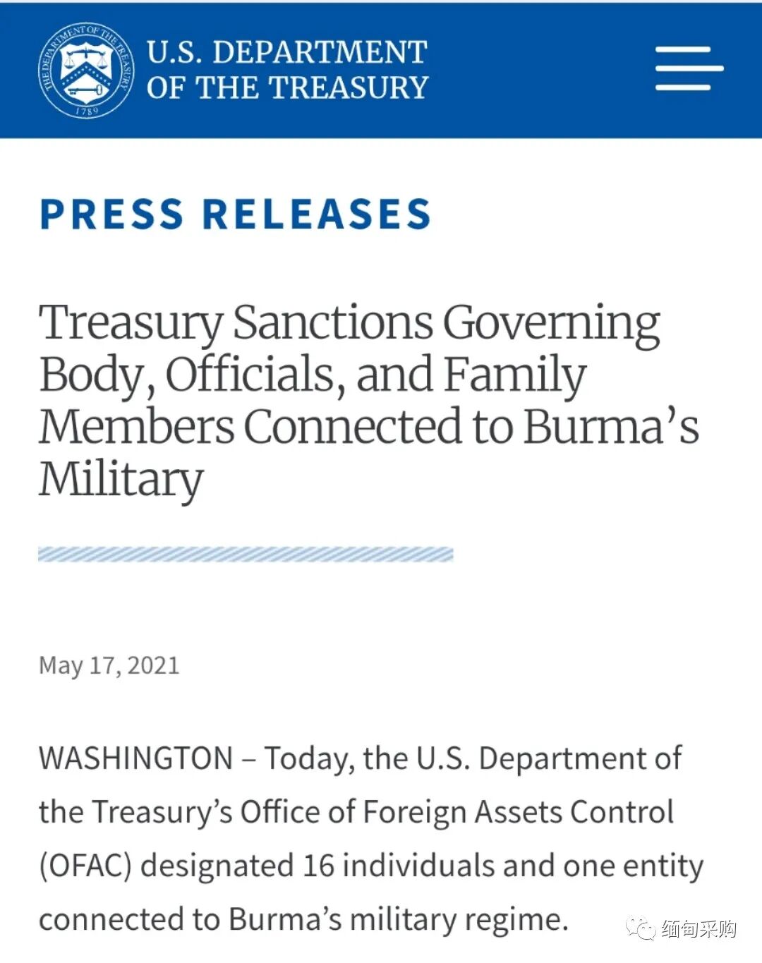 美国财政部5月17日宣布对缅甸国家管理委员会以及该委员会下属13名官员、3名官员子女实施制裁。同一天,英国外交大臣拉布宣布对缅甸珠宝公司(MGE)实施制裁。
