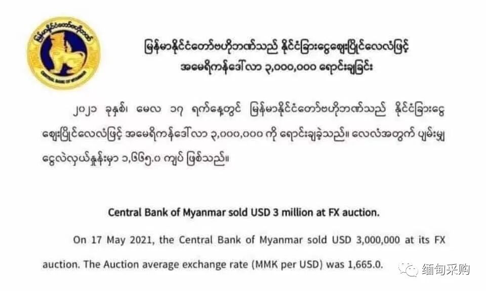 △缅甸央行今日抛售美元的通告