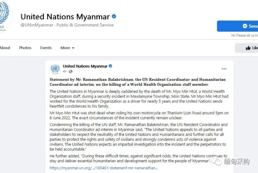 声明中还表示,在毛淡棉被枪杀的吴谬敏途(U Myo Min Htut)在世卫组织缅甸办事处担任汽车驾驶员近五年之久。