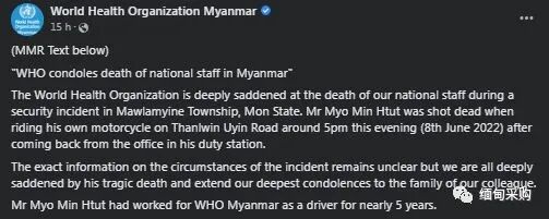 世界卫生组织驻缅甸办事处称,Myo Min Htut在世卫组织驻缅甸办事处担任了近五年的司机。他于6月8日晚在骑摩托车下班回家的路上被枪杀。