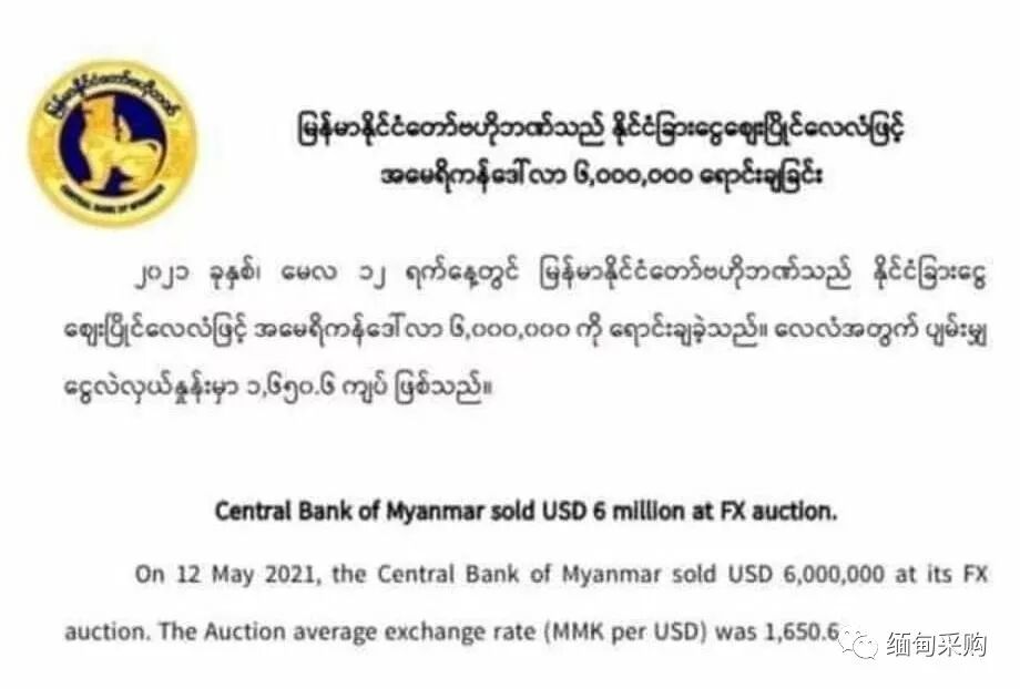当地时间5月12日,缅甸央行宣布将投放六百万美元平衡市场汇率。当日缅甸央行规定的缅币汇率为1650缅币兑换1美元,但是目前实际市场汇率已经超过1700缅币兑换1美元。