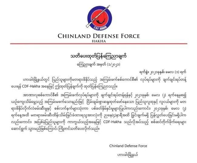 5月1日,首府哈卡的钦邦保卫军发布声明,要求缅军立即终止镇压当地人,呼吁军政府结束暴力行为、任意逮捕和拘留。此外还要求当地所有被抓捕的抗议者必须于2021年5月2日下午4点前无条件释放,否则将进行必要的行动以保护平民。