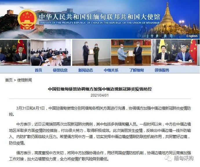 中新网4月2日电 据中国驻缅甸大使馆网站消息,3月31日和4月1日,中国驻缅甸使馆分别同缅甸各相关方面进行沟通,协调缅方加强中缅边境新冠肺炎疫情防控。