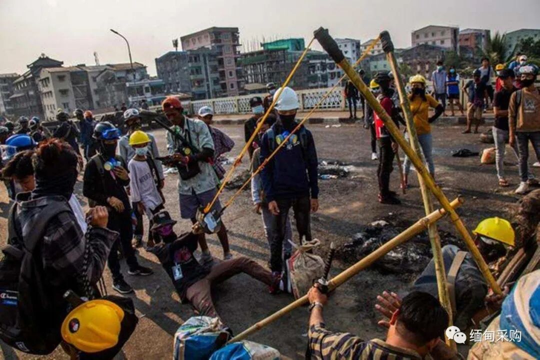 使用弹弓发射投掷物的缅甸示威者