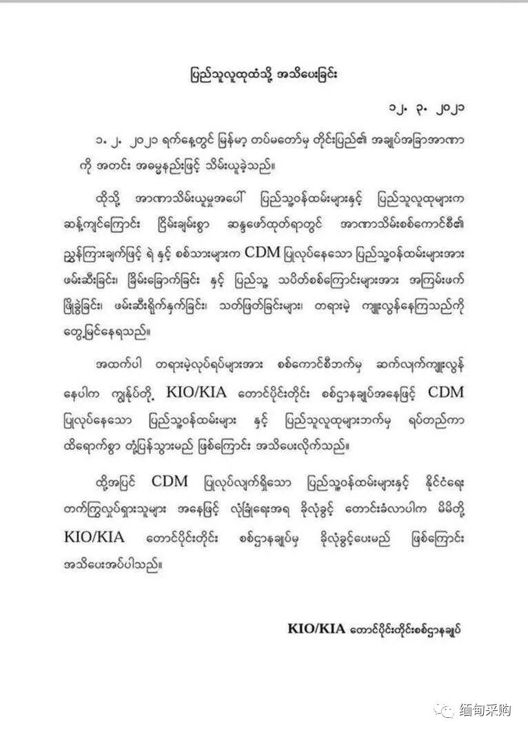 本公众号"缅甸采购"推送内容来源于网络,不代表任何政治立场,仅供阅读、欣赏!我们对文中观点保持中立,对所包含内容准确性、可靠性或完整性不提供任何明示或暗示的保证,并不对文章观点负责。版权属原作者。如有侵权,请联系我们及时修正。微信号:t990528
