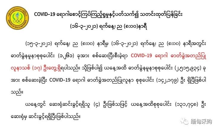 3月16日晚缅时8时,缅甸卫生与体育部疫情通报如下: