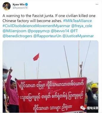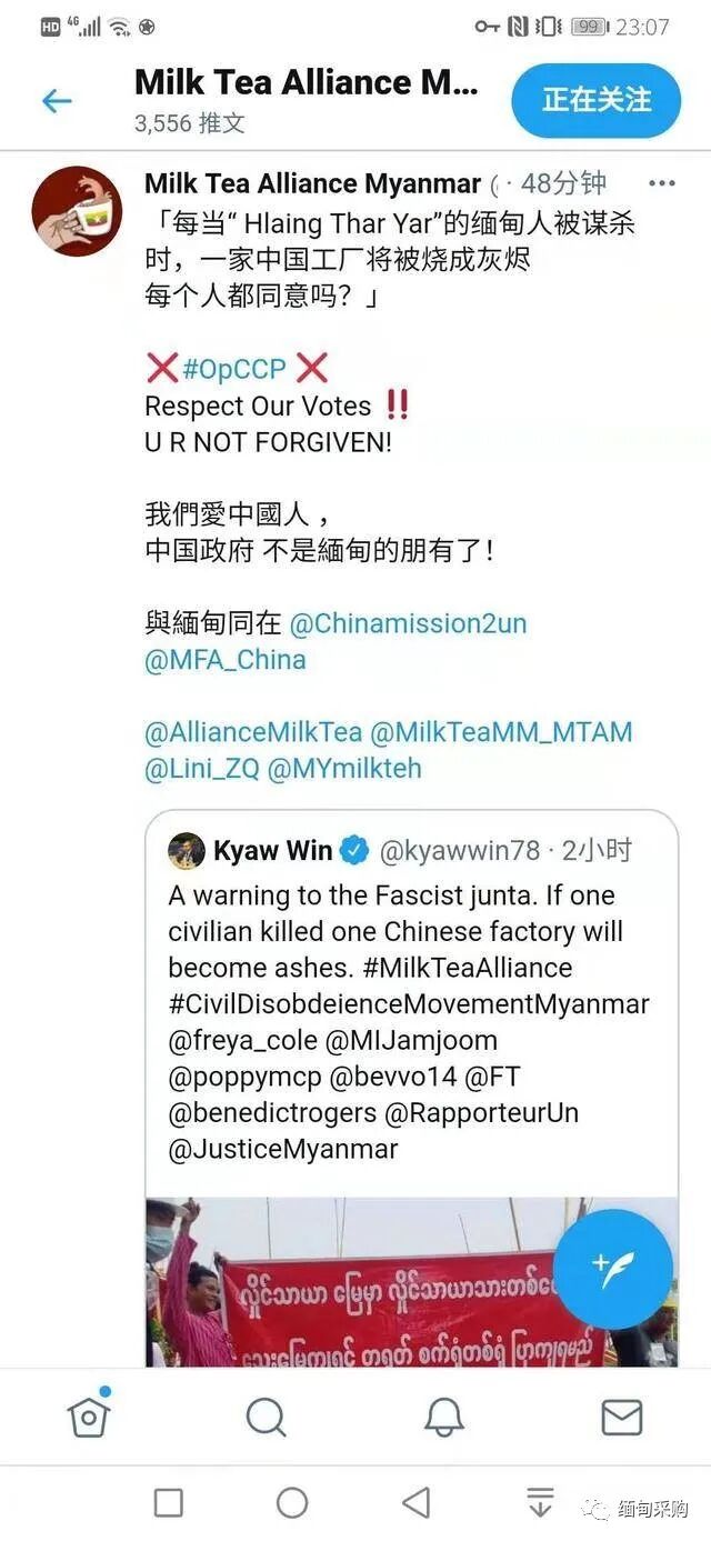 《环球时报》记者注意到,早在此次打砸事件发生的前两天,在当地社交媒体上就已经有组织威胁要让中资工厂“化为灰烬”。当地时间12日,一个官方认证为“缅甸人权网络(BHRN)创始人兼执行主任”的账号“Kyaw Win”就在推特上发文警告缅甸军方,称如果在示威过程中“有一个平民被杀,一家中国工厂就会化为灰烬”。该推文得到了大量转发,其中包括一个名为“缅甸奶茶联盟”的账号。