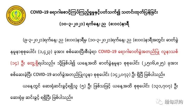 3月10日晚缅时8时,缅甸卫生与体育部疫情通报如下: