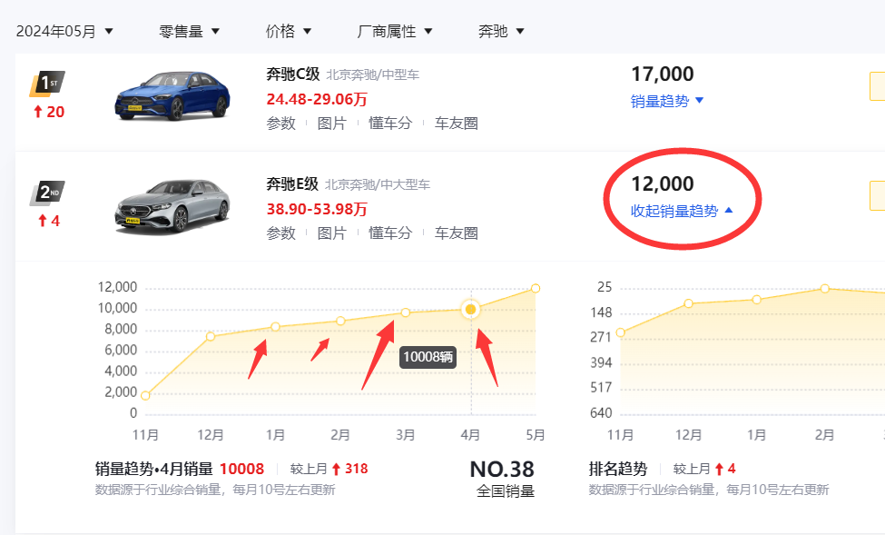 但是2024年5月份,奔驰E级的销量达到了1.2万台,看起来很不错,但是该车自从全新换代以来,该车从今年的1月、2月和3月都未能销量破万,去年11月更是最低跌到了1786台,这对于这款奔驰的利润奶牛来说绝对是巨大的打击。