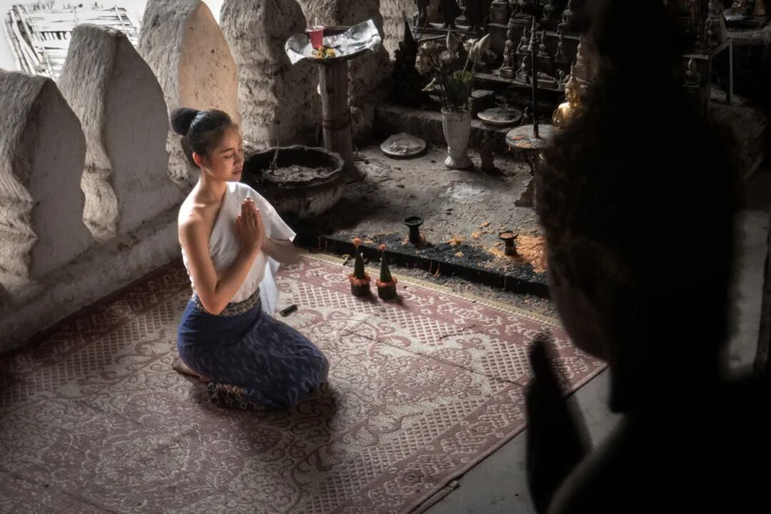 清晨的微风中,糯米饭的香气袅袅飘散。人们早早预备好糯米饭,在门前的暗影里虔敬地或坐或跪,静静恭候着橙色袈裟的僧侣们徐徐而来。