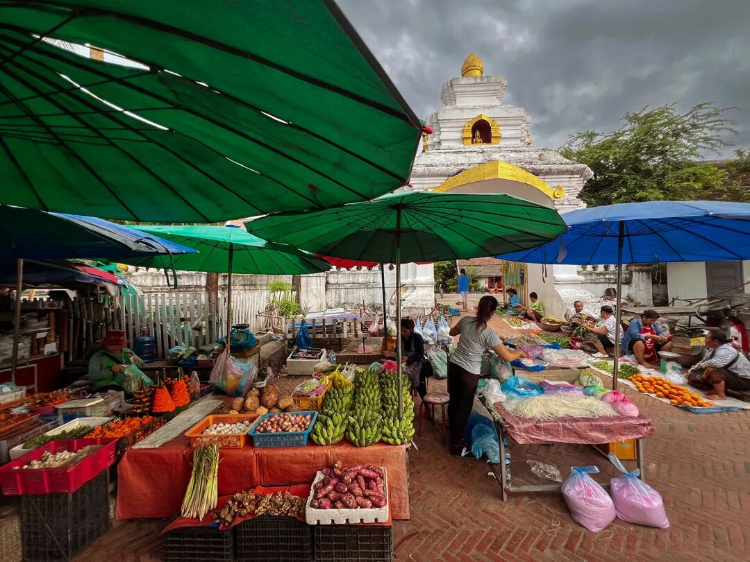 辞别化缘的队伍,我步入热闹的早市。此处有着最真实的人间烟火,和生活最本真的模样。摊位上的蔬果色彩绚烂,鲜活的鱼虾跳跃着生命的节奏,热气腾腾的小吃散发着诱人的香气。人们的讨价还价声,摊主的热情吆喝声,交糅成一曲洋溢活力的生活乐章。在这看似寻常的市井喧嚣中,蕴含着老挝人对生活的热爱以及对岁月的从容。