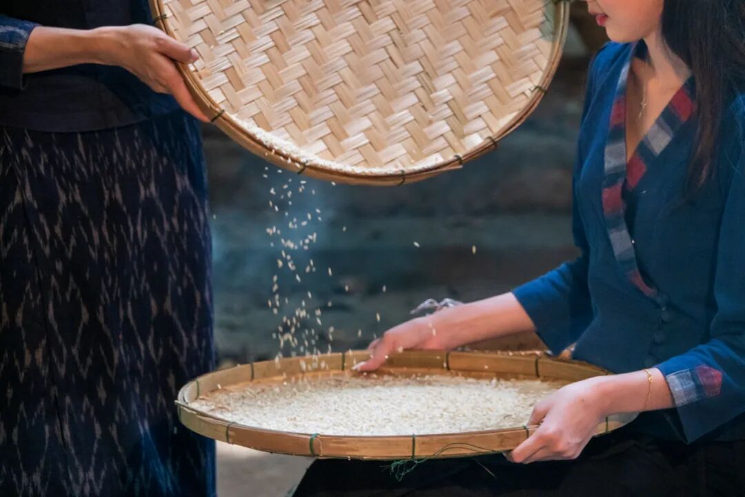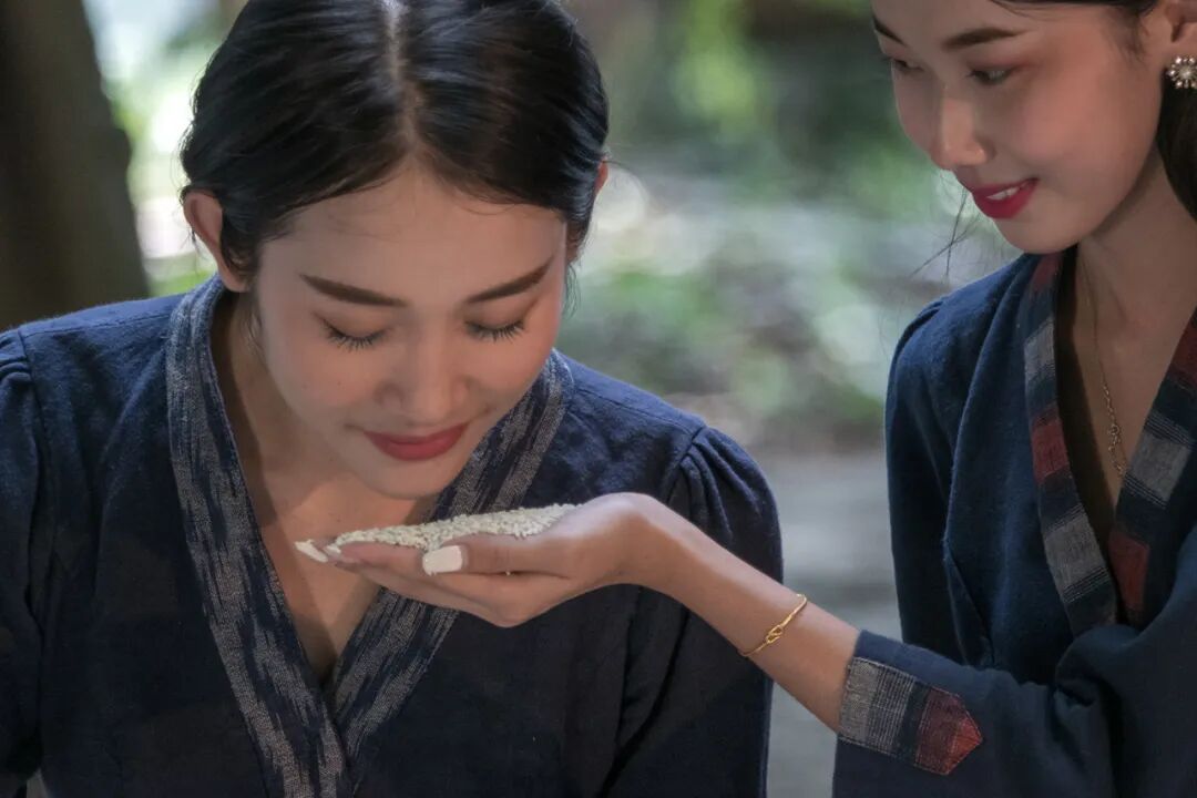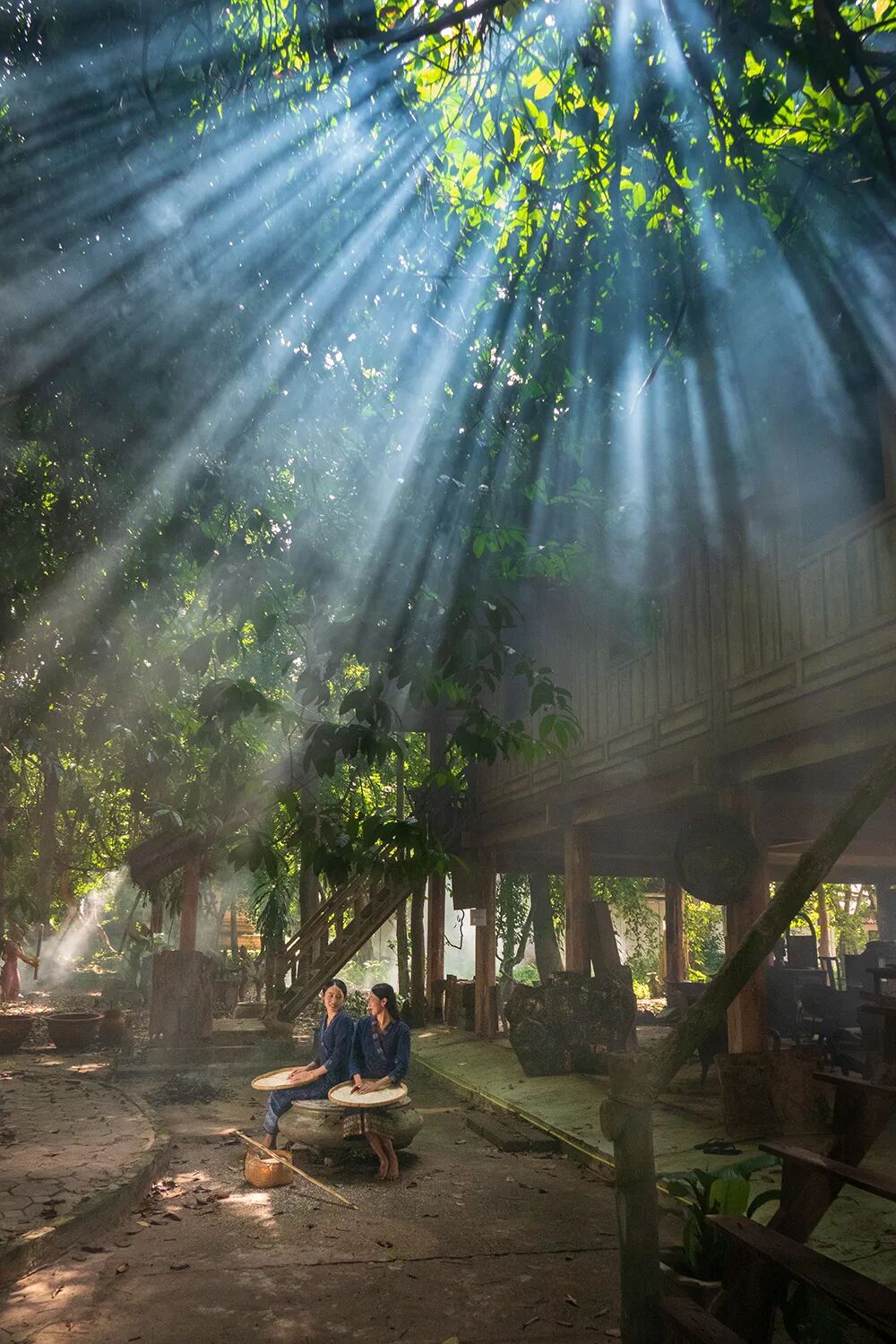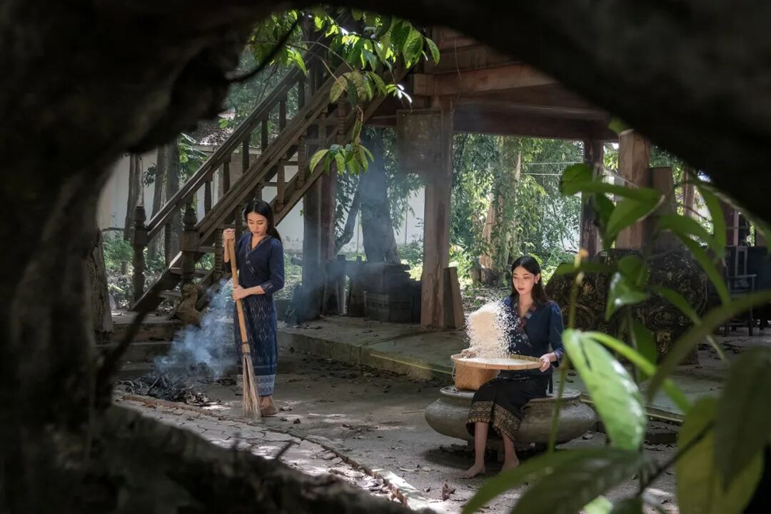 记得在那座饱经风雨却依然散发着古朴韵味的传统双层木楼前,两位温婉的老挝少女正全神贯注地舀米。她们那浸润了汗水的肌肤,竟比手中的米粒还要晶莹剔透、饱满盈润。