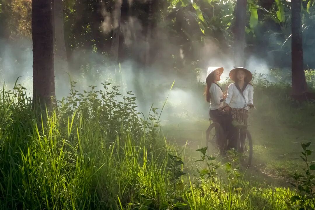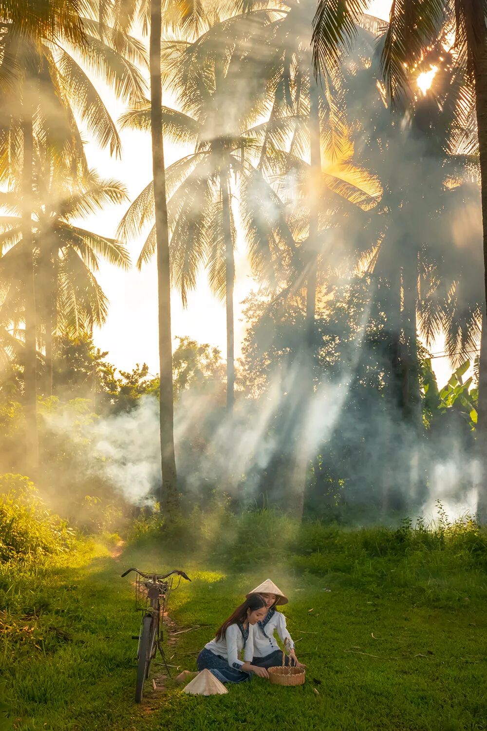 还有那个余晖绚烂而温柔的傍晚,少女推着自行车,悠然漫步于椰树林间,身姿轻盈仿若随风摇曳的椰树枝条。微风拂过我的面颊,带来缕缕清凉,空气中那若隐若现的稻香,融合着椰林特有的清新气息,令人心醉神迷。椰树叶沙沙作响,宛如在为她们的脚步奏响轻柔的乐章。