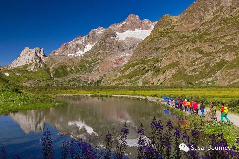 一路走到繁华盛开的百利山谷,清澈见底的湖水平静如镜,行进的队伍如彩虹般倒影湖中,如此天堂般的美景,是不愿停歇的脚步才能丈量到的地方。