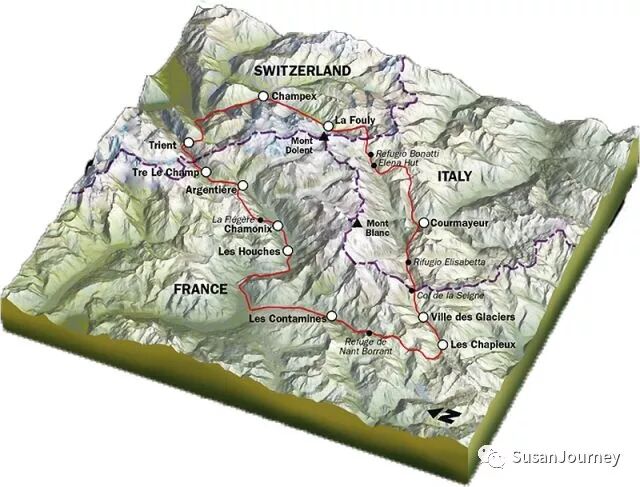 这条绝美的徒步线路,以小镇夏慕尼为起点,穿越法国、意大利、瑞士3个国家,全程170公里,爬升累计超过10000米。