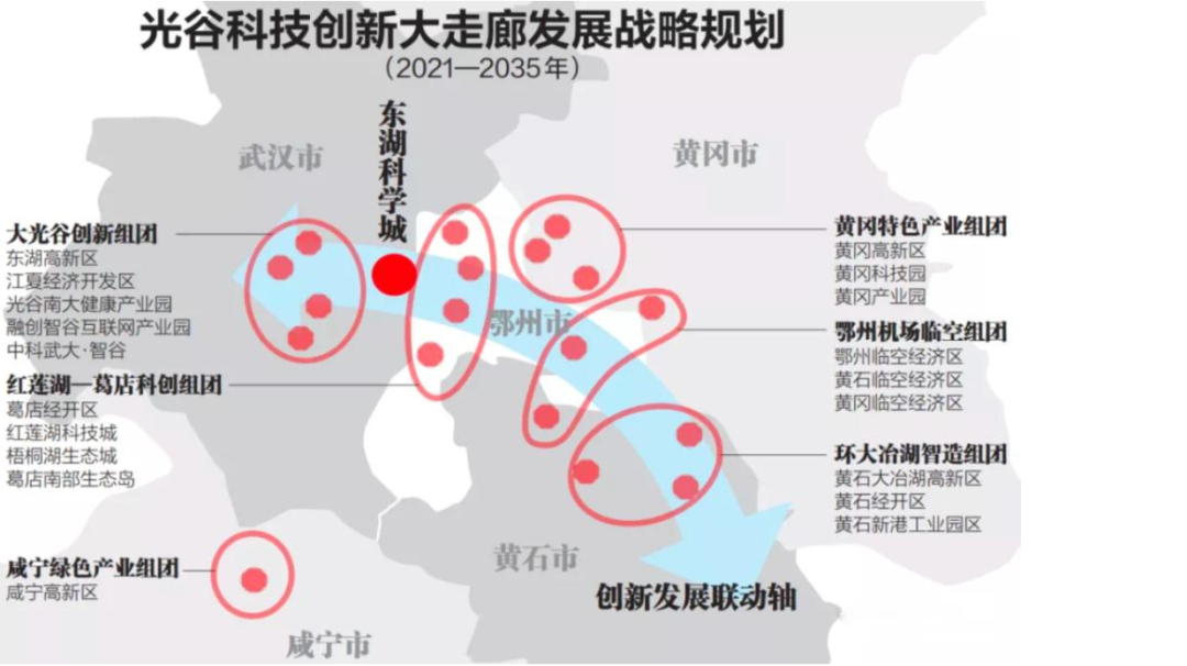 作为一个从郊野变成中心的地方,它的发展快速且迅猛,为了尽快地实现远大的发展目标,湖北进行了整体布局,以光谷东为中心,以高新大道为主轴,串起两个万亿产业集群,大力发展光谷科技创新大走廊,带领鄂东三市发展。