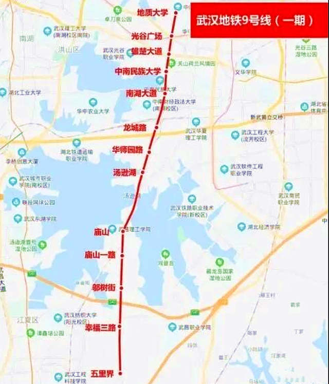 9号线一期,起于地质大学,终点至五里界,线路全长约 20.2km,其中地质大学到汤逊湖这一段是光谷的。
