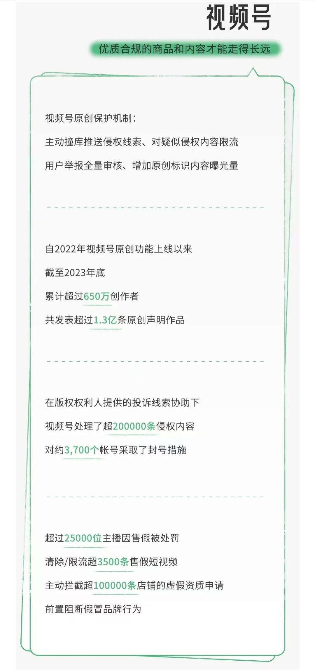同时,视频号清除或限流超3500条售假短视频,拦截超10万条店铺的虚假资质申请。为推动平台生态的健康发展,视频号可谓是重拳出击。